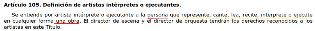 Ahora usaremos como referencia el artículo 105 de la LPI, que recoge la definición legal de “artista intérprete o ejecutante”.