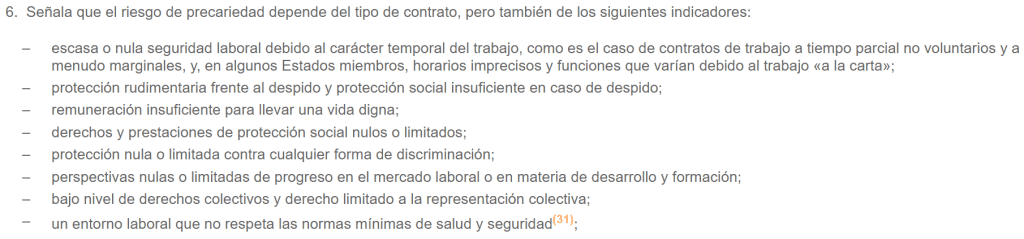 Por último, se enumerarán algunos de los indicadores de precariedad en el empleo que definió el Parlamento Europeo en 2017: