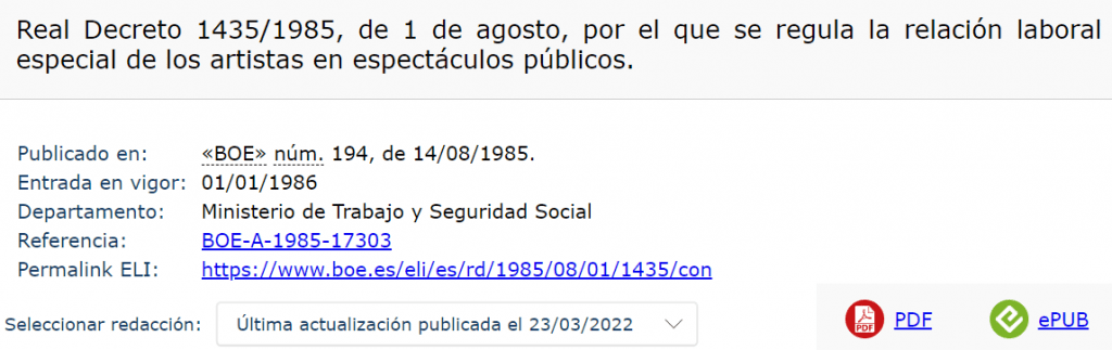 En 2022, tras casi 40 años conservando su redacción original, fue reformada y actualizada la ley que rige el régimen especial de los artistas en espectáculos públicos. Esta norma es el Real Decreto 1435/85, que consta únicamente de doce artículos para regular la gran cantidad de particularidades relacionadas con las condiciones laborales de esta actividad artística.
