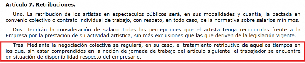 Si los artistas no disponen de representantes legales no pueden concretar en un Convenio Colectivo las condiciones laborales esenciales: retribución, jornada de trabajo, descansos, vacaciones… Tampoco otros asuntos más específicos del ámbito artístico, sobre los cuales el RD 1435/85 no se pronuncia o delega precisamente en la negociación colectiva para regularlos.