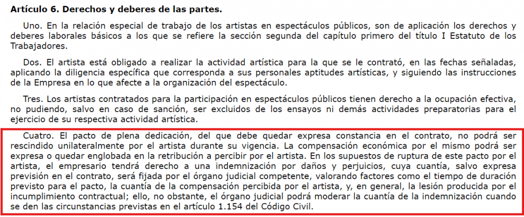 - El artista no puede rescindir el contrato cuando hay un pacto de plena dedicación. Si lo hace, debe indemnizar al empleador por daños y perjuicios. Algunas empresas incluyen cláusulas abusivas o cifras desorbitadas como cuantía indemnizatoria cuando existe este pacto. El RD 1435/85 conserva el texto original referido a este pacto tras la reforma de 2022.
