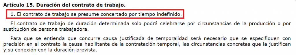 El Estatuto de los Trabajadores establece que «el contrato de trabajo se presume concertado por tiempo indefinido». Toda la legislación laboral común está orientada a fomentar la contratación indefinida. En cambio, la regla general en la contratación de los artistas en espectáculos públicos es la duración determinada. Lo excepcional, como se puede comprobar con los datos del SEPE, es encontrar trabajadores con un contrato fijo. Ello supone una gran inestabilidad laboral para el personal artístico.