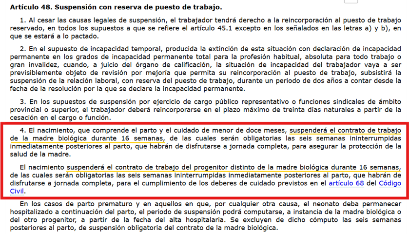 El Estatuto de los Trabajadores (ET) reconoce en su artículo 48.4 tu derecho a suspender tu contrato y que te reserven el puesto de trabajo durante 16 semanas por el nacimiento de tu hijo. De esas 16 semanas, las 6 primeras deberás disfrutarlas obligatoriamente desde la fecha de nacimiento y de forma continuada, mientras que las restantes 10 semanas podrás acordar con tu empresario cómo y cuándo disfrutarlas.