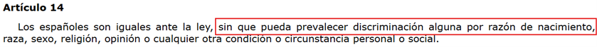 Este es uno de los argumentos que emplea el Tribunal Supremo para justificar esa afirmación: «entre los supuestos [de discriminación] que cita el artículo 14 [de la Constitución] está específicamente el nacimiento, pues señala que los españoles son iguales ante la ley, sin que pueda prevalecer discriminación alguna por razón de nacimiento, raza, sexo, religión, opinión o cualquier otra condición o circunstancia personal o social. El tipo de familia no puede, por tanto, determinar la diferencia de trato, de modo que el nacido en una familia monoparental disfrutará del cuidado, atención y protección familiar […] por un tiempo muy inferior, 16 semanas, que tendría si hubiera nacido en una familia biparental, 26 semanas».