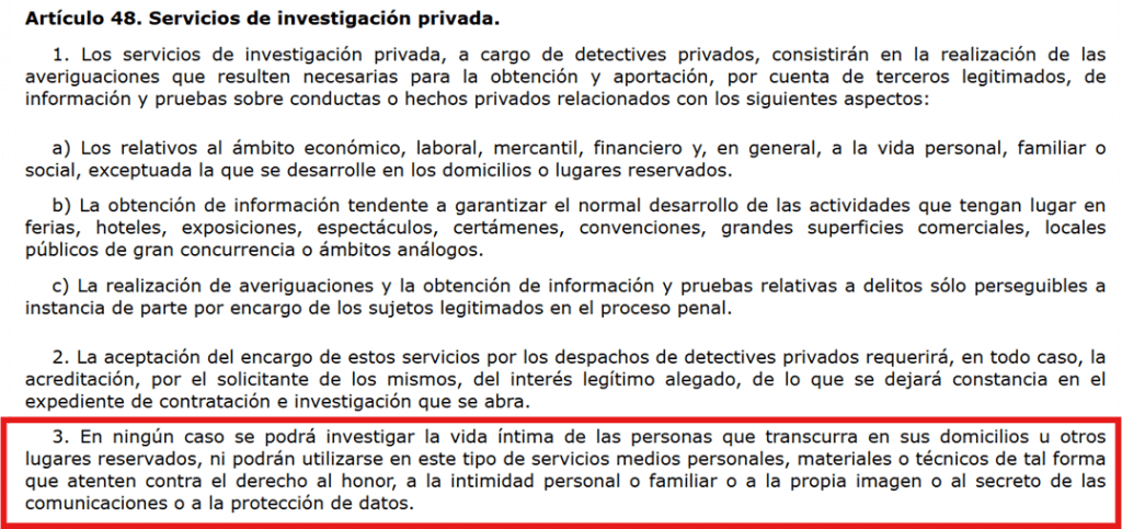 Además, la Ley de Seguridad Privada, en su artículo 48.3, prohíbe expresamente realizar averiguaciones en el domicilio del investigado o en otros lugares reservados. Y siempre se debe hacer respetando su intimidad y su derecho al honor y a la propia imagen.