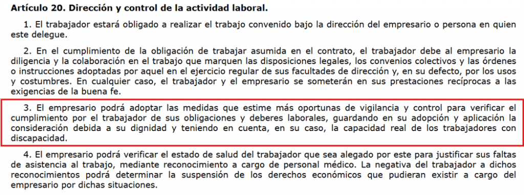 Ahora sí, después de esta explicación, podemos centrarnos en la pregunta planteada. El Estatuto de los Trabajadores, en su artículo 20.3, autoriza al empresario a utilizar las medidas de vigilancia y control que considere oportunas para asegurarse de que sus empleados respetan sus obligaciones laborales. Entre estas obligaciones se incluye, por supuesto, el cumplimiento de los horarios.