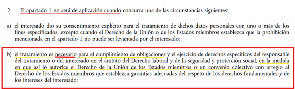 El siguiente apartado del mismo artículo, el 9.2, habla del tratamiento de datos personales específicamente en el ámbito laboral. Solo existe un supuesto en el que el uso de datos biométricos o cualquier categoría especial de datos en este entorno no estaría prohibido. Para ello se deben dar dos requisitos: que sea estrictamente necesario y que lo permita el convenio colectivo.